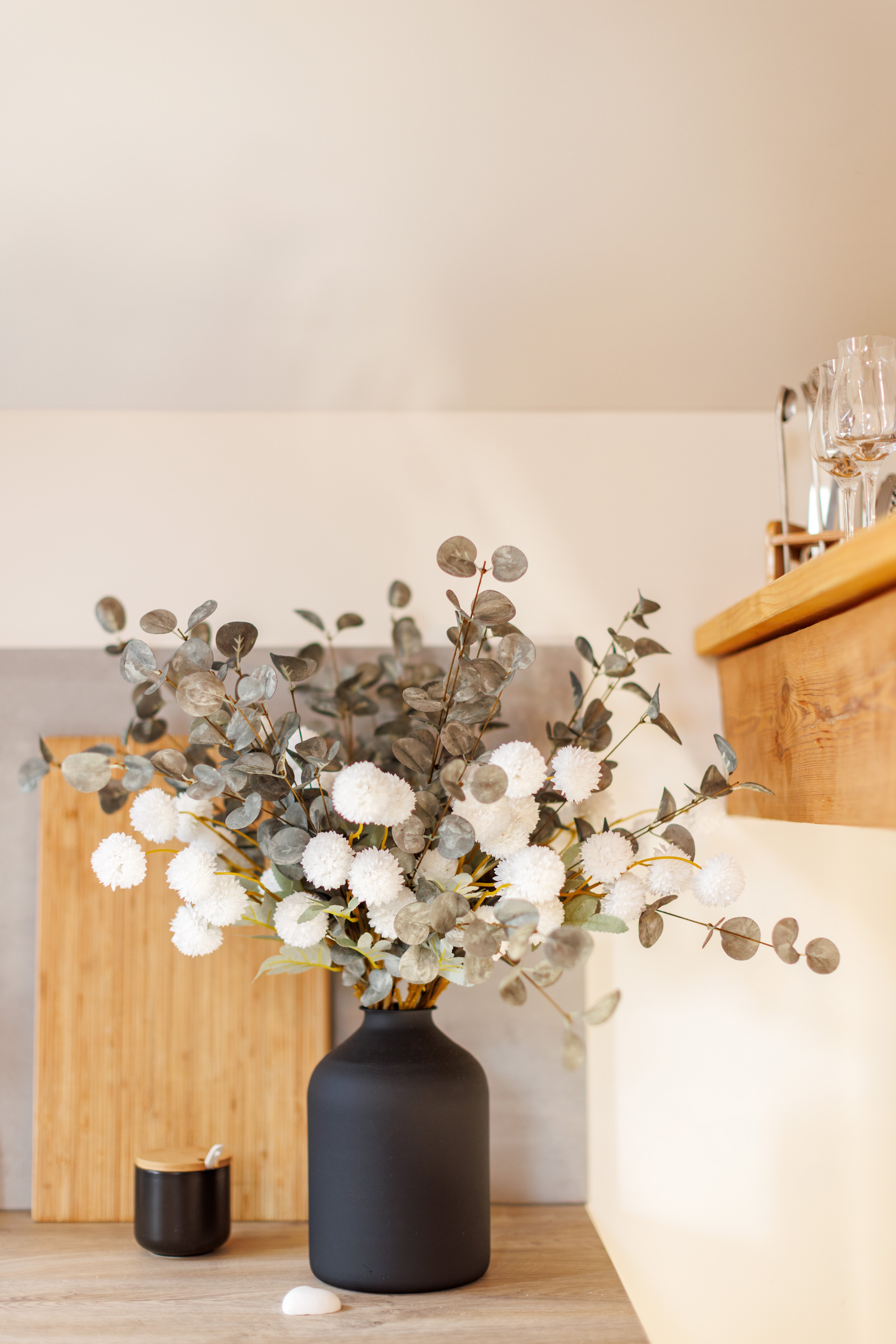 Eine geöffnete Tür, frische Blumen auf dem Tisch, Licht, das langsam in den Raum fällt.