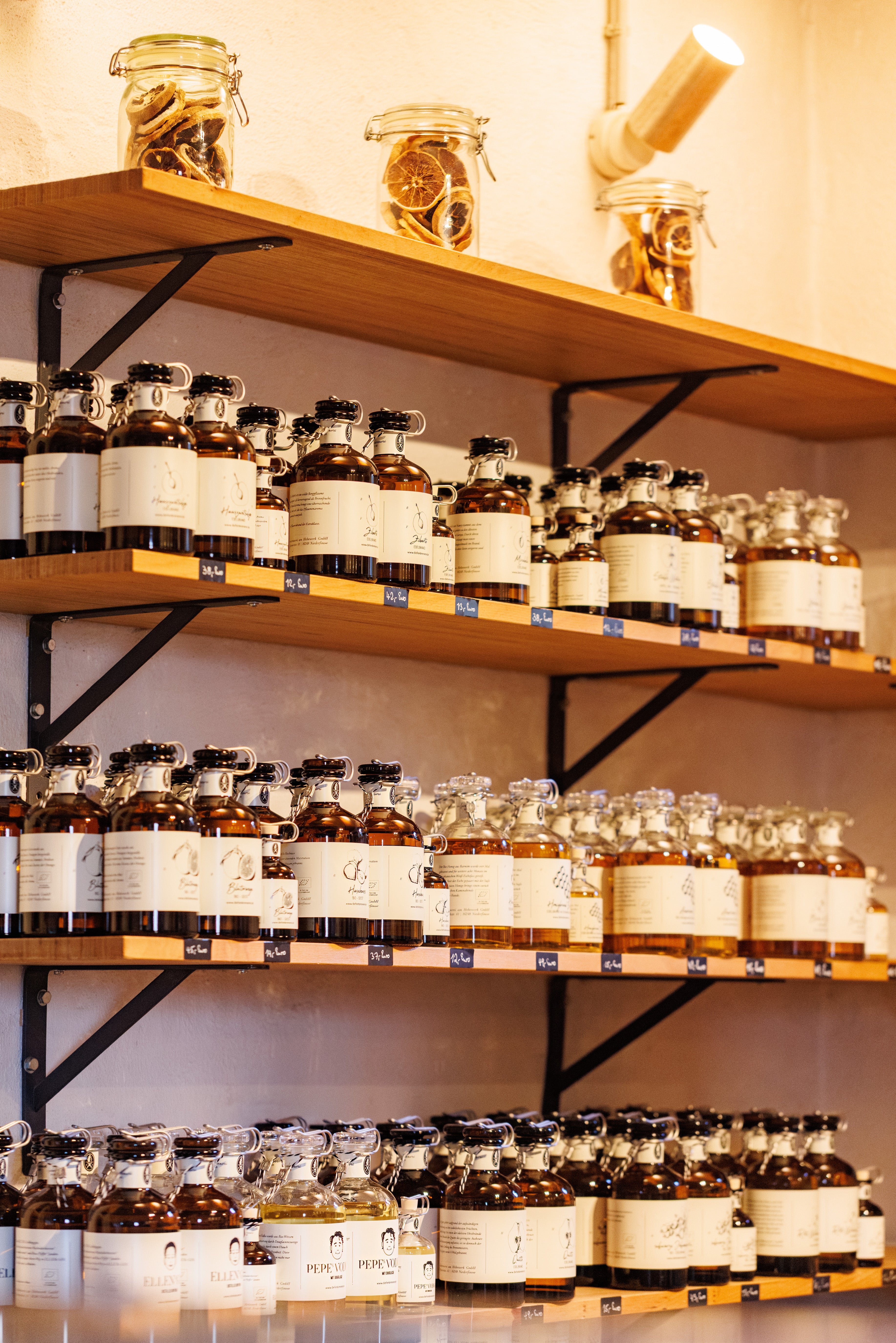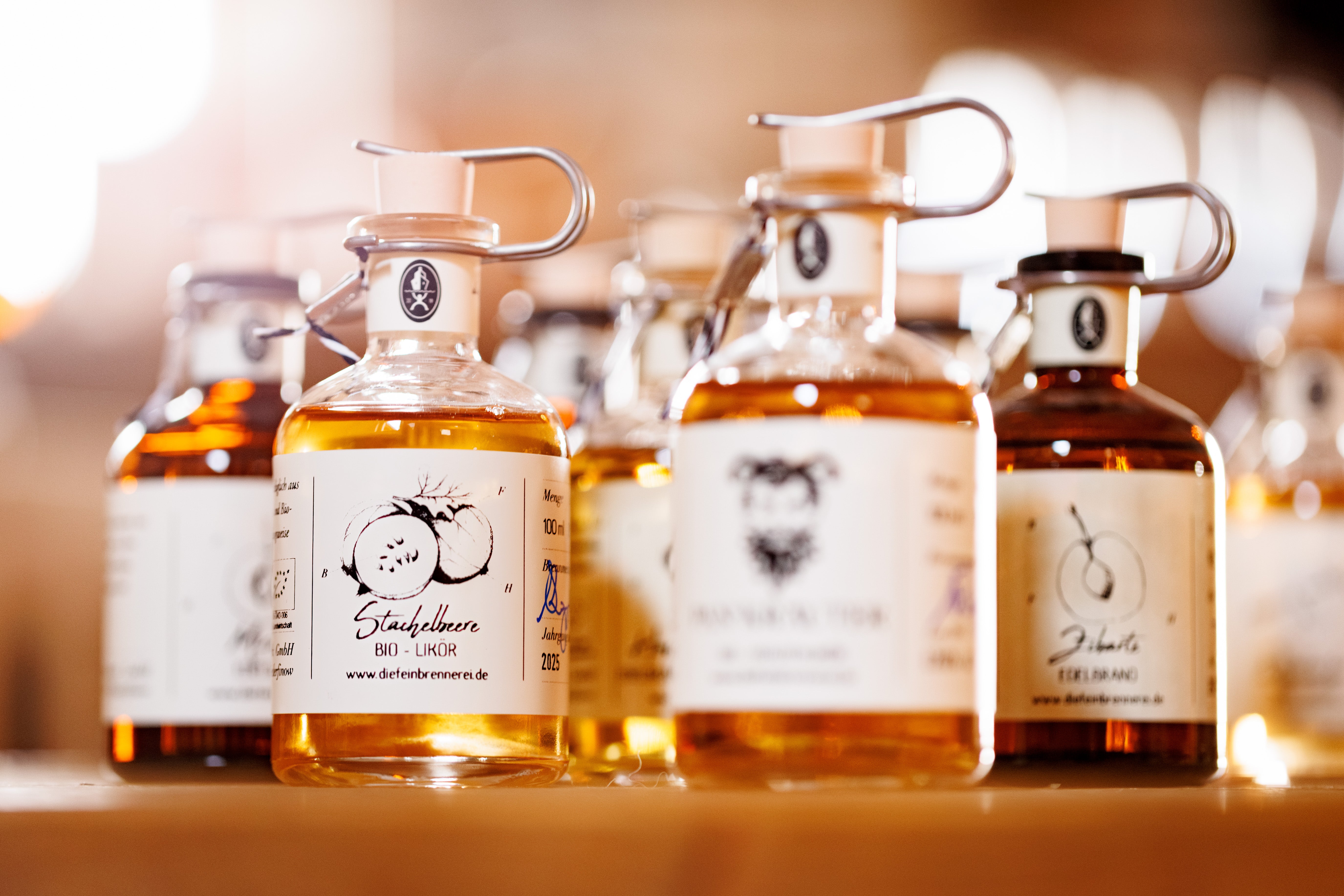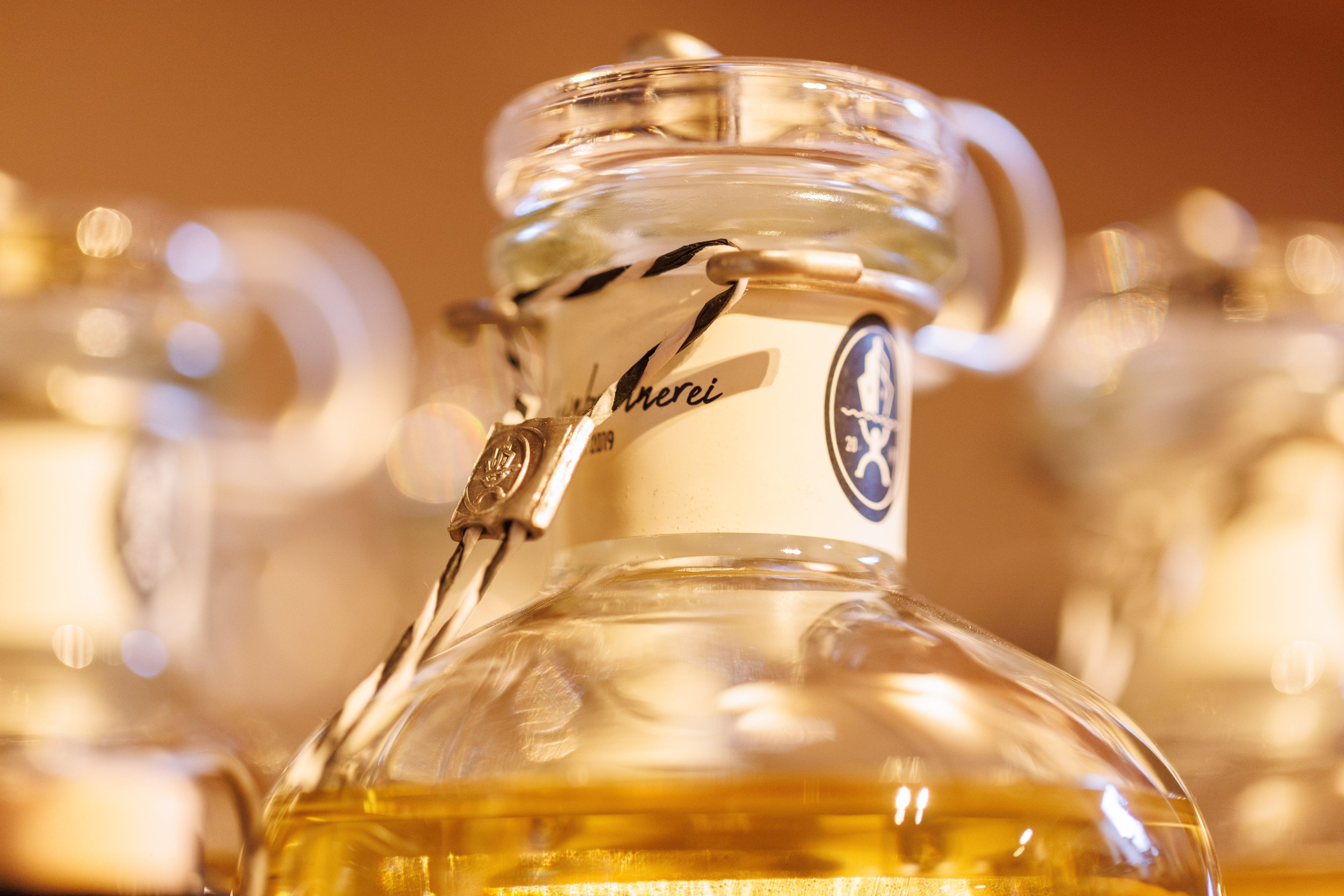 Unsere Produktion ist keine industrielle Serienfertigung. Jede Flasche wird von Hand befüllt. Von Hand etikettiert. Von Hand verplombt. Die Etiketten drucken wir selbst. Jede Charge ist nummeriert, jede Flasche trägt ihre eigene Nummer. Was unser Haus verlässt, ist echte Manufakturarbeit.